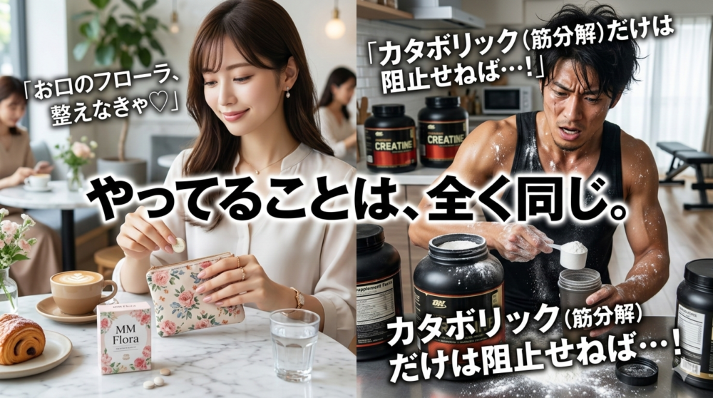 クレアチンを飲んで「あと1レップ挙がる気がする」と自分を騙し、彼女たちはMMフローラを舐めて「明日の朝も爽やかでいられる気がする」と自分を鼓舞する。