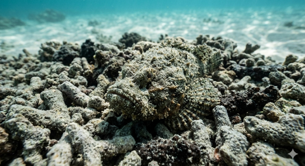 ミノカサゴは、サンゴ礁や岩場の影に潜んでいることが多い。