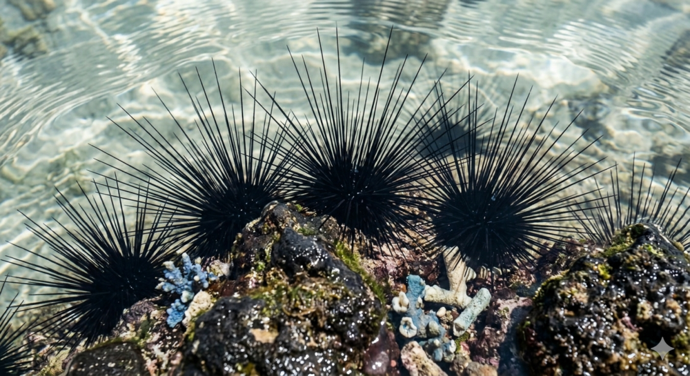 ガンガゼは、浅瀬の岩場やサンゴ礁の隙間に生息している。