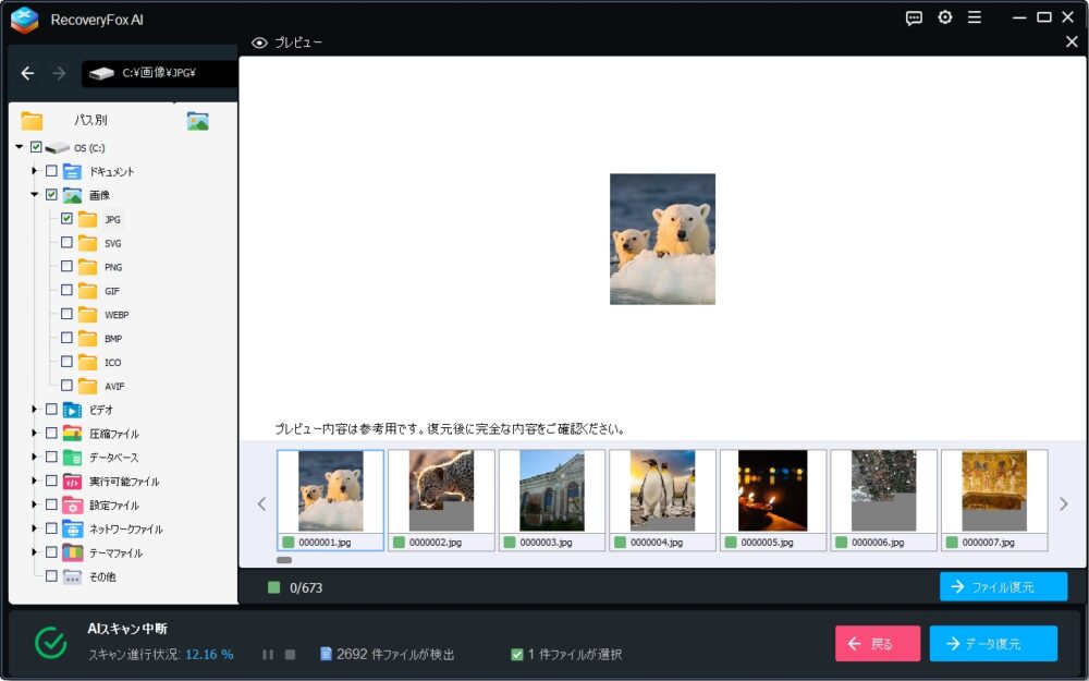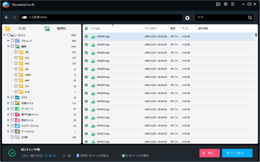 - スキャンの一時停止が可能 「お目当てのファイルがもう見つかった」という時は、スキャンを途中で止めてすぐに復元作業に入ることができる。