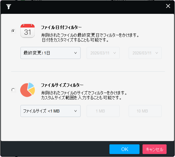 スキャン結果が膨大になると、目的のファイルを探すのが大変だ。 そんな時は、画面右上にあるフィルターアイコンをクリックする。