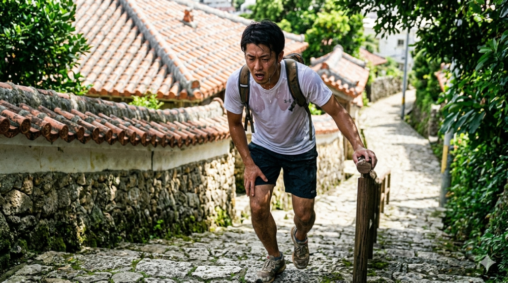 最初はそう感動していた。石垣から溢れ出すブーゲンビリアの赤、木漏れ日が作る複雑な模様、そして遠くに見える那覇の街並み。私は一眼レフを構え、情緒たっぷりの写真を撮りながら、一段、また一段と軽快に坂を下っていった。